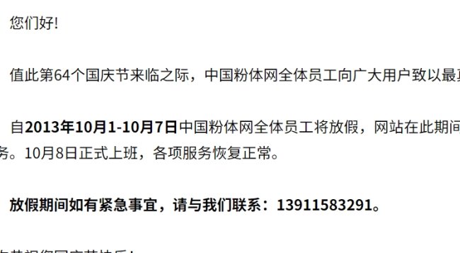 尊敬的各位中國粉體網用戶: 您們好! 值此第64個國慶節來臨之際,中國粉體網全體員工向廣大用戶致以最真摯的問候與祝福! 自2013年10月1-10月7日中國粉體網全體員工將放假,網站在此期間將暫停信息更新和相關服務。1