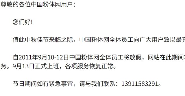 尊敬的各位中國粉體網(wǎng)用戶: 您們好! 值此國慶節(jié)來臨之際,中國粉體網(wǎng)全體員工向廣大用戶致以最真摯的問候與祝福! 自2011年10月1-7日中國粉體網(wǎng)全體員工將放假,網(wǎng)站在