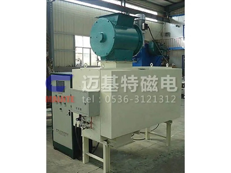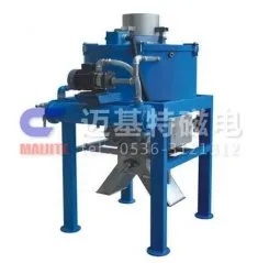 MJT-DF系列電磁干粉高梯度磁選機是我公司專門針對干粉物料研究開發的一種新型除鐵設備,是礦山、耐火材料、陶瓷、玻璃、化工、石英等行業的高純除鐵設備,能除去小顆粒或粉狀非磁性原料中的鐵磁雜質。其效果達到國內外同類產品領 先水平。采用油水復合冷卻,磁場強度高達30000GS,吸力強大,抓捕力強,不僅可以將原料在研磨過程中產生的機械鐵基本除凈,(除鐵效果高達98%),而且一般永磁除鐵設備難以去除的原礦中氧化鐵(Fe2O3)也可以除去一部份,除鐵效果卓越。