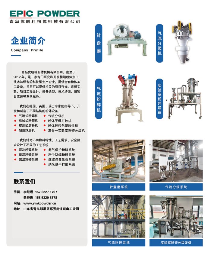 青島優明科粉體機械有限公司,成立于2012年,是一家專門研究和開發精細粉體加工技術與設備的科技型生產企業,提供全套粉體加工設備,并且可以提供相關的項目咨詢、來樣實驗、項目工程設計、設備選型、技術培訓、舊項目改造等系列服務。
