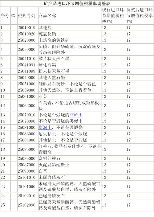 經國務院批準,2009年實行增值稅轉型改革,并調整礦產品增值稅稅率。礦產品進口環節增值稅稅率進行相應調整,自2009年1月1日起,附件所列稅目礦產品的進口環節增值稅稅率由13%提高到17%。