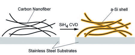 硅(右)覆蓋在碳納米纖維(左)上,形成了儲能更多、更輕的電極。圖片提供:Li-Feng Cul et al., Nano Letters