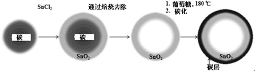 圖1. 在溶液熱合成中制取的碳包覆SnO2空心納米球具有不同的SnO2厚度