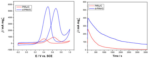 圖2 商業PtRu/C與d-PtNi/G催化劑催化甲醇的活性(左)和穩定性(右)