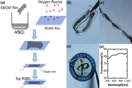 圖1 (a) CNT/PDMS透明彈性導(dǎo)體的制備流程,(b,c,d) CNT/PDMS彈性導(dǎo)體的光學(xué)照片,顯示其柔韌性和透明性,(e) CNT/PDMS