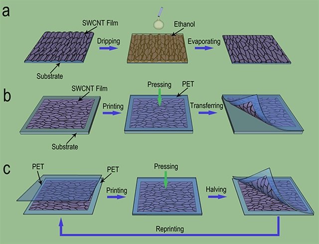 圖1 碳納米管薄膜減薄過程示意圖。(a)碳納米管薄膜平整過程示意圖;(b)利用轉移印刷法將碳納米管薄膜從基底轉移到PET過程示意圖;(c)重復轉移印刷法減薄碳納米管薄膜過程示意圖。