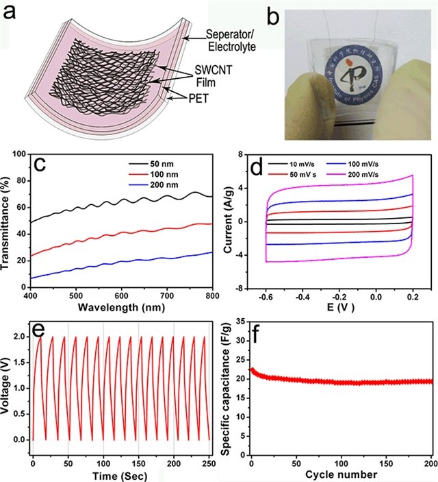 中科院物理研究所/北京凝聚態物理國家實驗室(籌)先進材料與結構分析實驗室“納米材料與介觀物理”課題組多年來一直致力于碳納米管薄膜的制備、物性與應用研究,取得了一系列成果( Adv. Mater. 2009 , 21 , 603; Nano Lett. 2009 , 9 , 2855; Nanoscale 2011 , 3 , 3731; Nano Lett. 2011 , 11 , 4636; Energ. Environ. Sci. 2011 , 4 , 1440)。最近,該課題組牛志強博士、周維亞研究員、解思深院士等與本所清潔能源實驗室黃學杰研究組馮國星博士、李泓研究員、胡勇勝研究員,新加坡南洋理工大學材料科學與工程學院陳曉東教授和澳大利亞臥龍崗大學智能聚合物研究所陳俊博士合作,充分利用直接生長的自支撐柔性碳納米管薄膜獨特的連續網絡結構、高電導率、高力學強度、高透光率等特點,研究了這種碳納米管薄膜在儲能器件和透明柔性電子學等領域的應用。