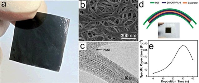 圖3 (a)超薄碳納米管/聚苯胺異質結構薄膜的光學照片;(b)SEM圖像和(c)TEM圖像;(d)柔性透明碳納米管超級電容器的示意圖及光學照片;(e)沉積聚苯胺不同時間碳納米管/聚苯胺薄膜超級電容器電極的質量比電容。