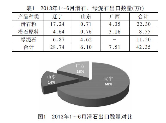 2013年1~6月中國滑石、綠泥石產量約80~90萬t。出口情況如表1、圖1所示。由表1可知,出口總計42.35萬t,其中粉體22.3萬t,原料8.55萬t,綠泥石11.5萬t。由圖1可見,三個出口主產地的數量遼寧最大,占68%,28.74萬t;廣西18%,7.51萬t;山東14%,6.1萬t。