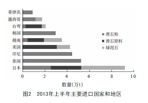 圖3是2008~2013年6月滑石的進口數量變化。進口增長的原因有兩個:一是國內原料價格持續上漲,而國外原料價格相對較低;另一個原因是國內市場需要更多的高端產品,需要進口來滿足。粉體的主要來源地是日韓和歐美,原料的主要來源地是巴基斯坦、埃及、朝鮮。