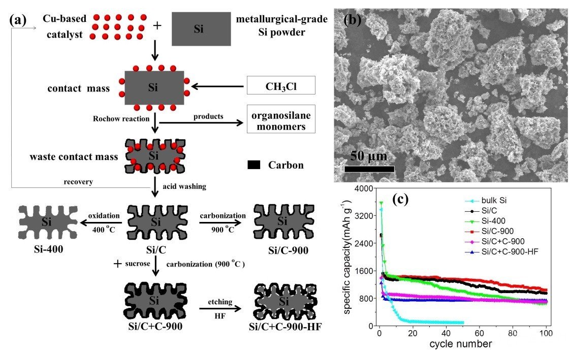 此外,他們利用有機硅主要單體二甲基二氯硅烷作為硅源和碳源,通過化學氣相沉積的方法,對商業化石墨負極材料進行表面改性,得到了性能優良的硅/碳復合負極材料(Journal of Materials Chemistry A 2013, 1, 4483-4489);利用單體合成中的廉價液相副產物一甲基三氯硅烷作為硅源和碳源,通過化學氣相沉積的方法,直接得到了高容量的硅/碳納米球形復合負極材料(Nanoscale 2013, 5, 5384-5389,Nanoscale 2014, 6, 371-377);利用有機硅工業生產中的含硅固體殘渣,經過提銅純化后,與商業石墨負極材料復合,制備了性能優良的硅/碳復合負極材料(Journal of Power Sources 2013, 228, 112-119)。該課題組同時在有機硅單體合成使用的銅基催化劑的制備與廢銅催化劑的回收利用等方面也做了大量工作,發表了多篇文章,并申請了系列國家發明專利,詳見課題組網頁(http://cpme.mpcs.cn/)。最近,他們又以廉價軟碳材料(炭黑、石油焦、針狀焦等)和硅粉(商業納米硅粉、廢觸體提取的硅粉)等為原料,通過噴霧成球并高溫處理,得到多種微球復合負極材料,并申請了國家發明專利(201310053208.5、201310108230.5、201310214417.3),部分研究結果將陸續發表。
