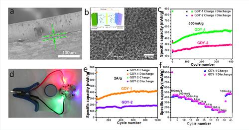 理論研究表明石墨炔是一種非常理想的儲鋰材料,理論容量達744 mAh g-1,多層石墨炔理論容量可達1117 mAh g−1(1589 mAh cm−3),且其獨特的結構更有利于鋰離子在面內和面外的擴散和傳輸,這樣賦予其非常好的倍率性能。