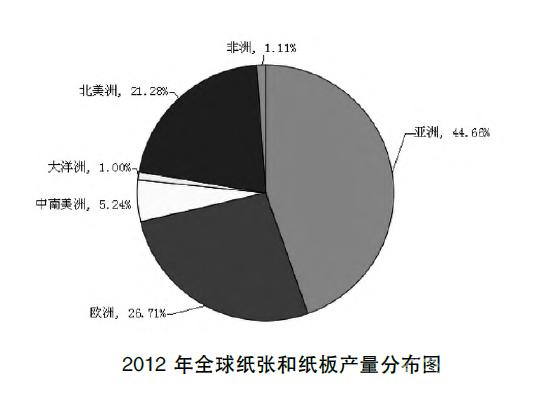 2012 年全球紙張和紙板總量為3.998 億t,亞洲、北美洲和歐洲作為全球主要的紙張和紙板生產(chǎn)地,其產(chǎn)量占全球總量的90%以上,其中亞洲占44.66%,如圖所示。按照平均每噸涂布紙及紙板用涂料大約220 kg,重質(zhì)碳酸鈣在造紙涂料市場的占有率按照42% 計算,每年全球共需涂料約8800萬t,需要重質(zhì)碳酸鈣約3700 萬t。盡管如此,由于產(chǎn)品結(jié)構(gòu)不合理,我國每年還要進口一定數(shù)量的超細重質(zhì)碳酸鈣產(chǎn)品。