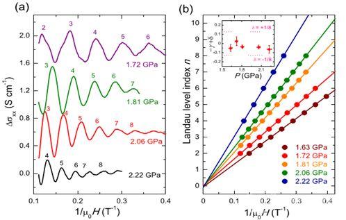 (a) 黑磷中壓力誘導的半金屬態的電導率振蕩;(b) 對朗道能級指標的分析表明其中存在拓撲非平庸的振蕩相位。