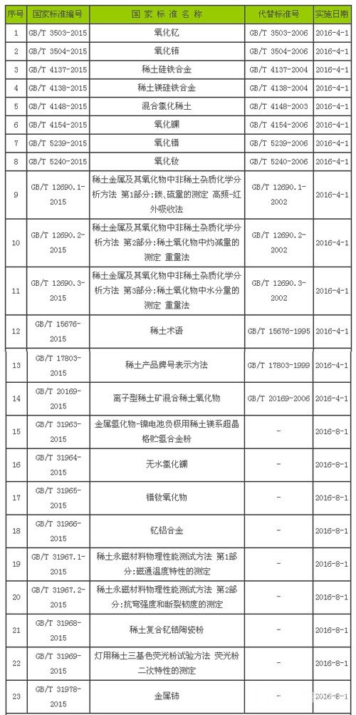 《金屬氫化物-鎳電池負極用稀土鎂系超晶格貯氫合金粉》、《無水氯化鑭》、《鐠釹氧化物》、《釔鋁合金》、《稀土永磁材料物理性能測試方法第1部分:磁通溫度特性的測定》、《稀土永磁材料物理性能測試方法第2部分:抗彎強度和斷裂韌度的測定》、《稀土復合釔鋯陶瓷粉》、《燈用稀土三基色熒光粉試驗方法熒光粉二次特性的測定》、《金屬鈰》共9項國家標準均為此次制定的新標準,自2016年8月1日起實施。