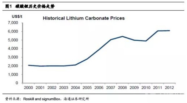 在1998至2009年間,碳酸鋰年平均價格增長至原先的三倍以上,從年均2000美元/噸上漲到大約6000美元/噸,尤其在2003至2007年間迅猛增長170%,這一方面是由于全球鋰電池和鋰化學品需求的增長,另一方面也是緣于兩家最大的碳酸鋰生產商對市場的主導權。