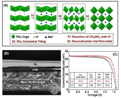 逄淑平課題組以解決鈣鈦礦太陽能電池應用所面臨的關鍵問題為導向,基于甲胺與鈣鈦礦材料可逆的作用機制,開發了鈣鈦礦薄膜的甲胺氣體修復技術,通過控制甲胺氣體分壓可以使鈣鈦礦材料自發吸入和脫出甲胺氣體,鈣鈦礦薄膜經過此“呼吸”過程可以快速修復薄膜中的缺陷結構,實現了大面積均勻鈣鈦礦薄膜的制備。相關成果發表于Angew. Chem.(Angew. Chem. Int. Ed. 2015, 54: 9705),Science 雜志在Editor’s choice版塊對此工作進行了亮點報道(Science 2015, 349: 600)。