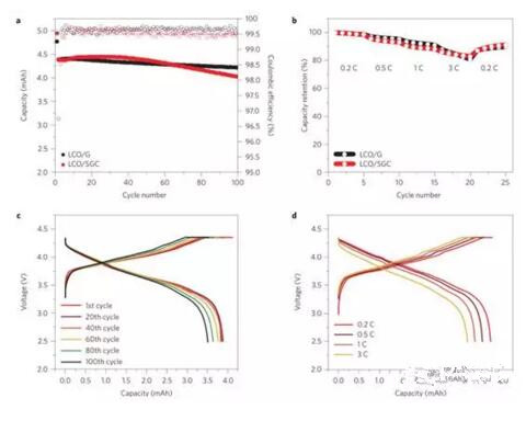 進一步以鈷酸鋰作為正極材料組裝全電池,發現SGC/鈷酸鋰(LCO)全電池能量密度1.043 Wh/L-1,高于目前商業鋰離子電池(900 Wh/L-1),平均放電電壓3.77V,同時具有良好的循環性能。