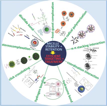 該專欄文章綜述了用于解決這一問題最有效的幾種物理作用力(π-π堆積、立構復合、氫鍵、主客體包絡、配位作用)及化學方法(自由基聚合、點擊化學、雙硫鍵、腙鍵)。以上方法可顯著提高聚合物膠束的腫瘤靶向效率,并已促成近十個基于聚合物膠束的靶向納米藥物進入臨床試驗階段。
