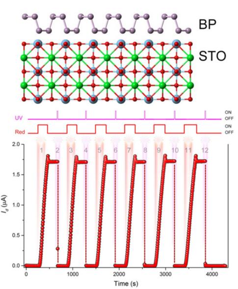通過與鈦酸鍶聯姻,二維黑磷的光電響應度得到了極大的提高,比之前報道提高了五個量級。同時黑磷-鈦酸鍶異質結表現出了良好的持久光電導現象,在低溫50K時觀測不到明顯弛豫現象。并且這種架構可以通過不同的波長實現開關效應:當紫外光照射時,異質結電導顯著下降;而在紅光照射下,電導開始增加,最終恢復到紫外光照之前的水平。光電導的開光比可以達到105量級。