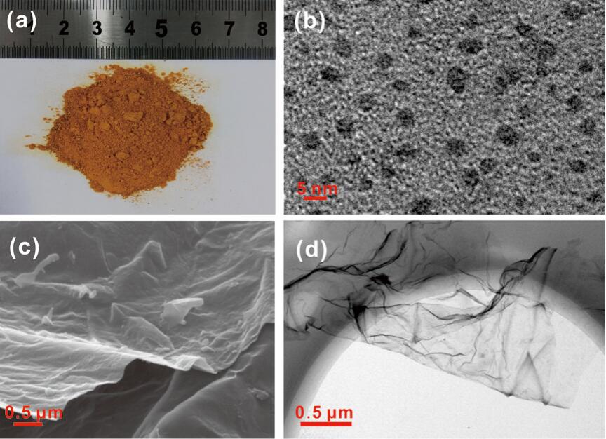 碳量子點的光學照片(a)和透射電鏡照片(b)磷摻雜碳納米片的掃描電鏡照片(c)和透射電鏡照片(d)