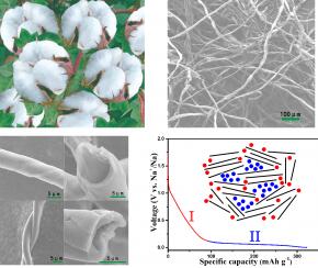 中科院物理研究所李云明博士生和胡勇勝研究員等利用可再生的天然棉花制備出高性能的硬碳材料,并對硬碳的儲納機理進行了系統深入地研究。他們以天然棉花的管狀結構為依托,通過一步碳化法成功制備出形狀規則的硬碳微管。將硬碳微管作為負極材料直接應用于鈉離子電池中后發現其儲鈉容量為315mAh/g,首周庫侖效率高達83%,且循環穩定性佳。
