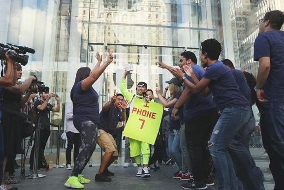 中國粉體網訊 下圖是國外果粉Jaime Gonzalez在紐約第五大道蘋果零售店門前扎營排了差不多一個月的隊,成為第一個入內拿起自己預訂的iPhone 7 Plus的果粉。