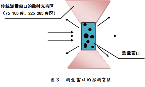 無(wú)論是何種設(shè)計(jì)的激光粒度儀,都存在一個(gè)測(cè)量窗口,樣品在窗口中充分分散,被激光照射,產(chǎn)生散射光。如圖3所示,傳統(tǒng)測(cè)量窗口由于機(jī)械結(jié)構(gòu)和光學(xué)玻璃存在全反射,總是存在一個(gè)散射光探測(cè)盲區(qū)。這個(gè)盲區(qū)大致分布在75-105度、255-285度區(qū)域內(nèi)。
