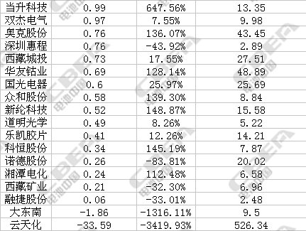 另一方面,有7家鋰電池材料企業凈利潤出現負增長,其中大東南和云天化兩家企業減幅較大,同比減少1316%和3419%左右。據了解,這兩家企業均有涉及鋰電膜材業務,但并非其主業,因而本報告期內的凈利潤暴減與鋰電新能源行業的快速發展關系不大。