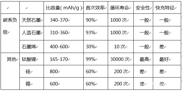 自從鋰離子電池在1991年產業化以來,電池的負極材料一直是石墨電極占主導地位,而近幾年隨著技術的發展,鈦酸鋰逐漸受到重視。為何石墨材料會受到沖擊?不同的負極材料在能量密度、安全性能等方面都有各自的特點,各自的參數決定著它們的性能。下圖為各種負極材料的參數對比表: