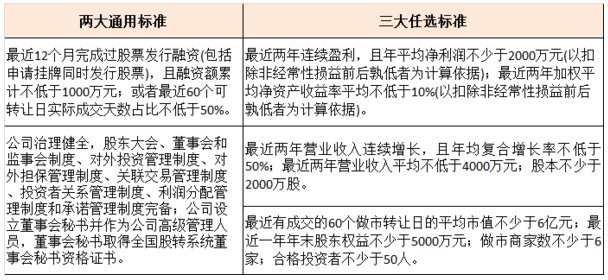 根據(jù)《新三板分層管理辦法》,入選創(chuàng)新層有兩大通用標(biāo)準(zhǔn)和三大任選標(biāo)準(zhǔn)。在滿足兩大通用標(biāo)準(zhǔn)的基礎(chǔ)上滿足任何一個任選標(biāo)準(zhǔn)即有望進(jìn)入創(chuàng)新層,其余則進(jìn)入基礎(chǔ)層。