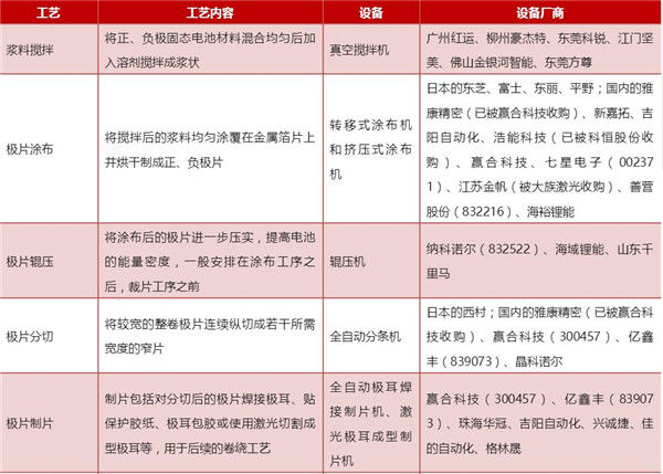 表1 鋰電池生產(chǎn)工藝及設(shè)備介紹