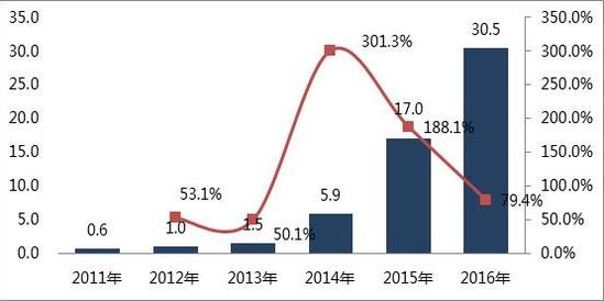 2011-2016年中國鋰動力電池出貨量:Gwh