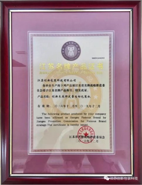 江蘇創新包裝科技有限公司研發的“創新未來”牌定量自動包裝機獲江蘇省名牌產品稱號,其產品包括閥口自動計量灌裝機、敞口自動計量灌裝和自動縫口機、噸袋自動計量灌裝機及自動上袋、自動封口、自動纏膜等相配套的包裝設備。