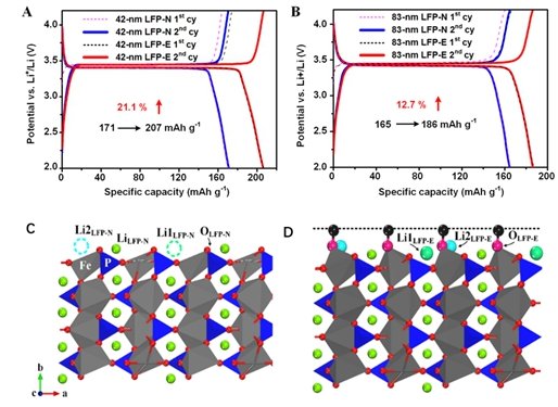 (A)40nm LiFePO4普通包碳和超容量包碳的充放電曲線圖;(B)83nm LiFePO4普通包碳和超容量包碳的充放電曲線圖;(C)裸露的LiFePO4界面;(D)重構之后的LiFePO4界面(N代表普通包碳方法,E代表超容量包碳方法)