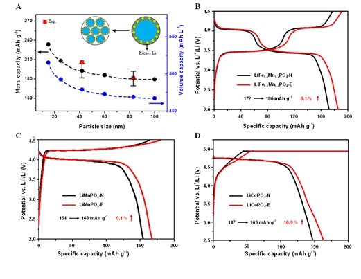 (A)LiFePO4粒徑對重構后容量的影響(黑點和藍點為理論值,紅點為實驗值);(B-D)磷酸錳鐵鋰、磷酸錳鋰和磷酸鈷鋰普通包碳和超容量包碳的充放電曲線圖