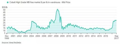 在2016年,全球金屬報價中鈷的價格從每磅10.30美元上漲了接近一半的價格,達到每磅14.70美元,從這以后鈷價格又上漲到每磅29.85美元,約為每噸65,808美元。