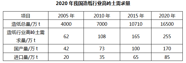 高嶺土在紙業生產中主要起填料和涂料作用。近年來我國造紙工業發展迅速,每年以約15%的速度遞增。當前,我國人均年用紙已達50kg左右,但與發達國家人均年用紙90kg左右仍有較大差距。據中國造紙協會調查資料顯示,2020 年,全國造紙產量預計為16500萬t左右。
