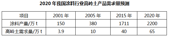 據 《中國涂料工業“十三五”發展規劃》,2020 年我國涂料總產量將達 2 200 萬 t,則高嶺土加工產品需求量預計在65萬t左右。