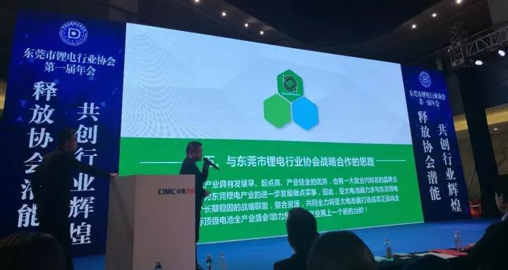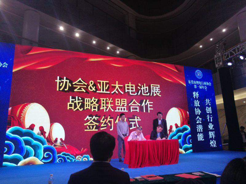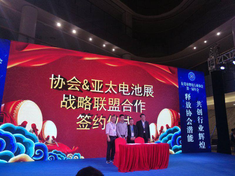廣州碩信展覽有限公司總經理曹成就“亞太電池展與東莞市鋰電行業協會戰略合作思路”做了詳細介紹。在協會秘書處的安排下,由協會名譽會長東莞市宏澤機電工程有限公司徐豐彩教授、協會會長/東莞振華能源科技有限公司董事長李樹軍為見證,協會秘書長/東莞市科銳機電設備有限公司董事長許剛、廣州碩信展覽有限公司總經理曹成分別代表東莞鋰電行業協會與亞太電池展舉行了隆重的戰略聯盟合作協議簽約儀式!現場數百位東莞鋰電同仁共同見證了這一歷史時刻!