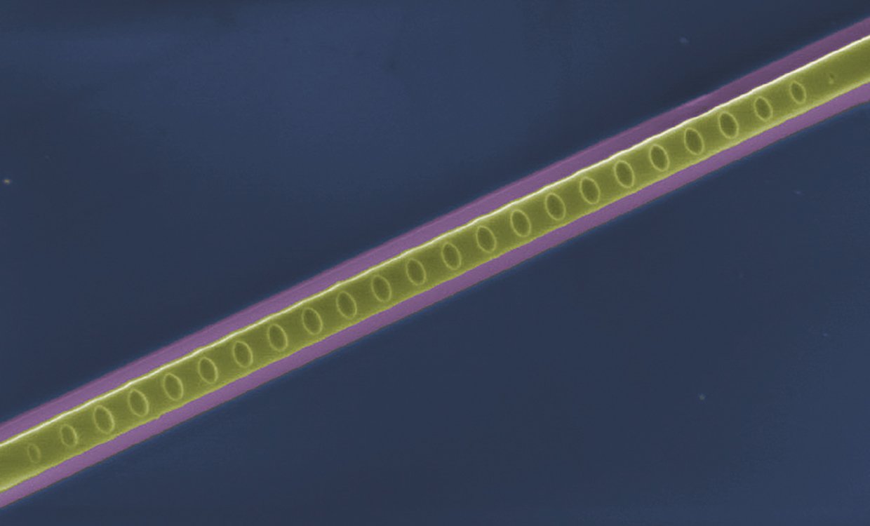 圖片來源:NIST/Nature Communications. 在這幅假彩色掃描電鏡圖中,單個(gè)光子從二氧化硅表面(藍(lán))上的波導(dǎo)(粉)中穿過。