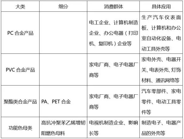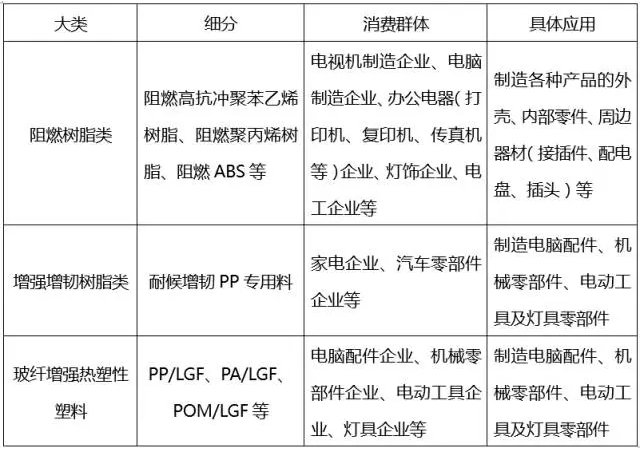 根據改性后的功能,改性塑料包括阻燃樹脂類、增強增韌樹脂類、塑料合金類、功能色母類等種類,各個種類按不同的材質又可以細分下去,由于各自性能的差異,應用領域的也不同。