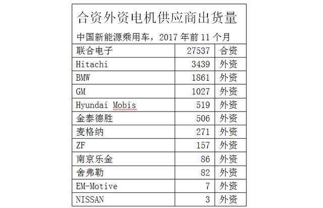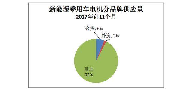 到目前為止,中國新能源汽車市場,無論整車還是核心零部件,還是自主品牌的天下。在新能源乘用車方面,2017年前11個月,電機出貨量45.43萬臺,其中自主品牌電機有41.89萬臺,占比92%;合資品牌聯合電子2.75萬臺,占6%;其余11家外資電機公司分享剩下的7958臺和2%的市場。