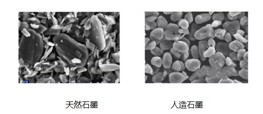 從上圖中就可以看出天然石墨和人造石墨在形貌上的區(qū)別。
