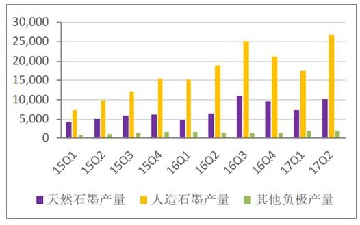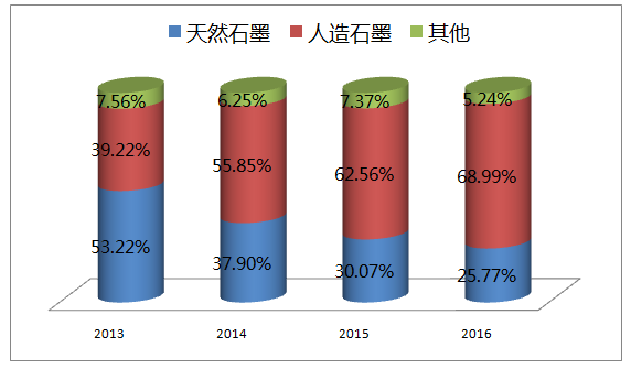 預計未來幾年,受新能源汽車應用影響,人造石墨占比將繼續(xù)上升:目前國內新能源汽車鋰電池所采用的負極材料大多使用人造石墨,新能源汽車在國家政策的扶持下呈爆發(fā)式增長階段,帶動動力電池的大幅增長,未來幾年動力電池將是拉動人造石墨產量大幅上升的主要引擎。