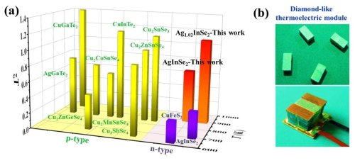 圖1.(a)n型AgInSe2類金剛石結構化合物熱電優(yōu)值;(b)首個類金剛石結構化合物熱電器件