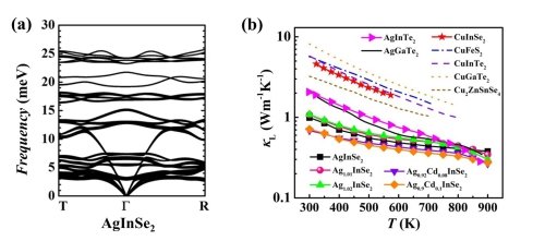 圖2.(a)n型AgInSe2類金剛石結構化合物聲子譜;(b)晶格熱導率