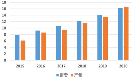 中國碳酸鋰消費和產(chǎn)量(萬噸)