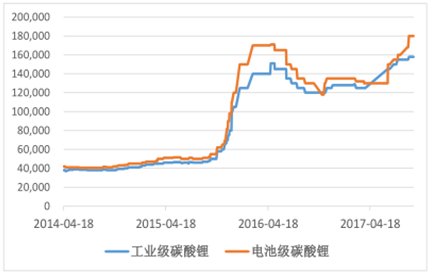 碳酸鋰主要應(yīng)用于陶瓷、玻璃、鋰電池等行業(yè),分為電池級和工業(yè)級碳酸鋰。工業(yè)級碳酸鋰的需求比較穩(wěn)定,每年增長為個位數(shù)。而電池級碳酸鋰占比約為 40%,隨著近幾年新能源汽車的快速增長,電池級碳酸鋰的需求年復(fù)合增長可達50%以上,拉動的了碳酸鋰的價格和需求的整體上漲。而隨著電池級碳酸鋰的需求持續(xù)增加,國內(nèi)碳酸鋰的供需仍存在缺口,隨著鹽湖提鋰的技術(shù)逐步完善,鹽湖提鋰仍將持續(xù)擴產(chǎn),大部分于新增產(chǎn)能將于 2019年至2020年期間建成到達產(chǎn),所以預(yù)計到 2020年國內(nèi)碳酸鋰供需將實現(xiàn)平衡。