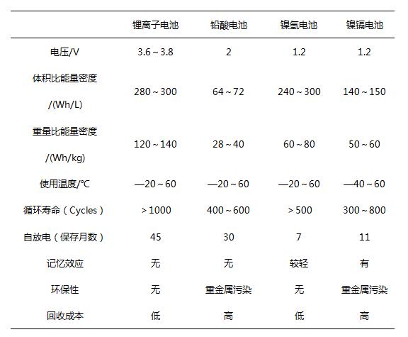 表1四種二次電池性能比較